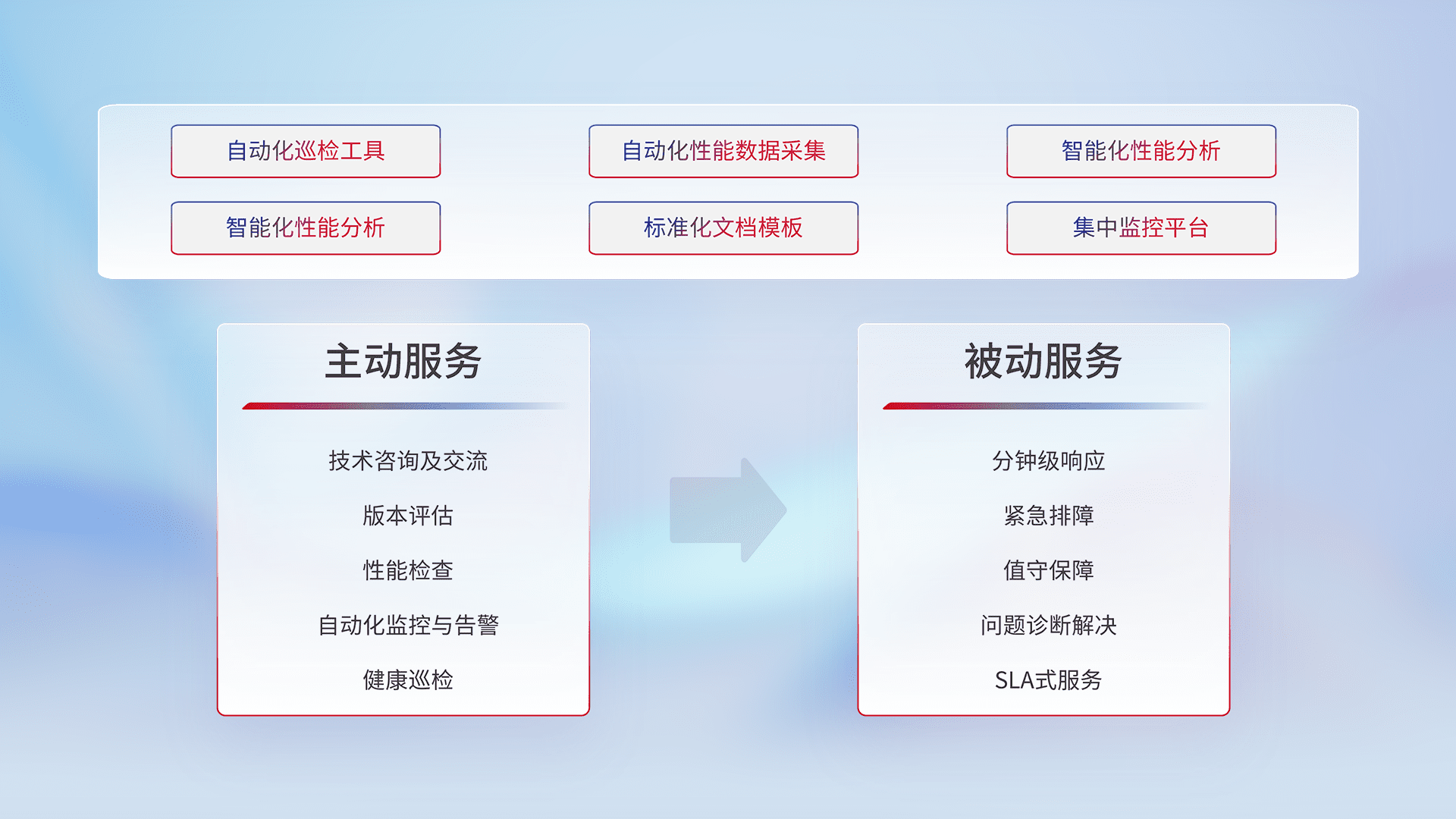 智能化工具和标准化文档,,保障服务质量,,,,提供主动服务(包含技术咨询、、、、版本评估、、、性能检查、、、自动化监控与告警、、健康巡检)和被动服务包含(分钟级响应、、、紧急排障、、值守保障、、、、问题诊断解决、、、、SLA服务)。。。。